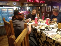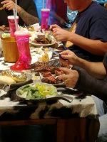 Im Big Texan gibt es ein etwa zwei Kilo schweres Riesensteak. Wer das vor den Augen der anderen Restaurantgäste innerhalb einer Stunde nebst Beilagen verschlingt, braucht nicht zu bezahlen - ansonsten werden schlappe 72 Dollar fällig. Wir begnügen uns mit einer normalen Portion und genießen die tollen texanischen Steaks.