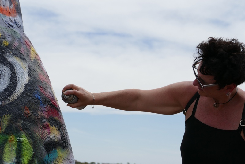 Wir fahren nach Nordwesten, an Amarillo vorbei, und erreichen nach wenigen Meilen die Cadillac Ranch. Das ist eine skurrile Installation der Künstler Chip Lord, Hudson Marquez und Doug Michels aus dem Jahr 1974. Das Kunstwerk besteht aus 10 Cadillacs, die bis zur Hälfte im Boden vergraben sind. Teil des Kunstwerks ist die ständige Veränderung. Jeder Besucher kann und darf sich mit Spraydosen an dem Werk verewigen.Natürlich hinterlassen wir auch unsere kunstvollen Grafittis...
