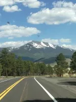 Wir haben Zeit und starten deshalb erst gegen 15.00 Uhr in Richtung Flagstaff, dass wir nach einer spektakulären Fahrt über die San Francisco Peaks Scenic Road am späten Nachmittag erreichen.Die kurvenreiche Bergstrecke führt am Humphreys Peak vorbei, der immerhin 3853 m hoch ist.